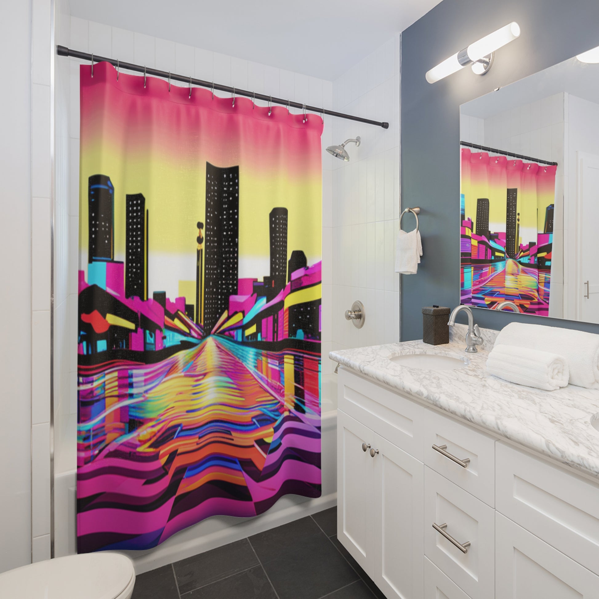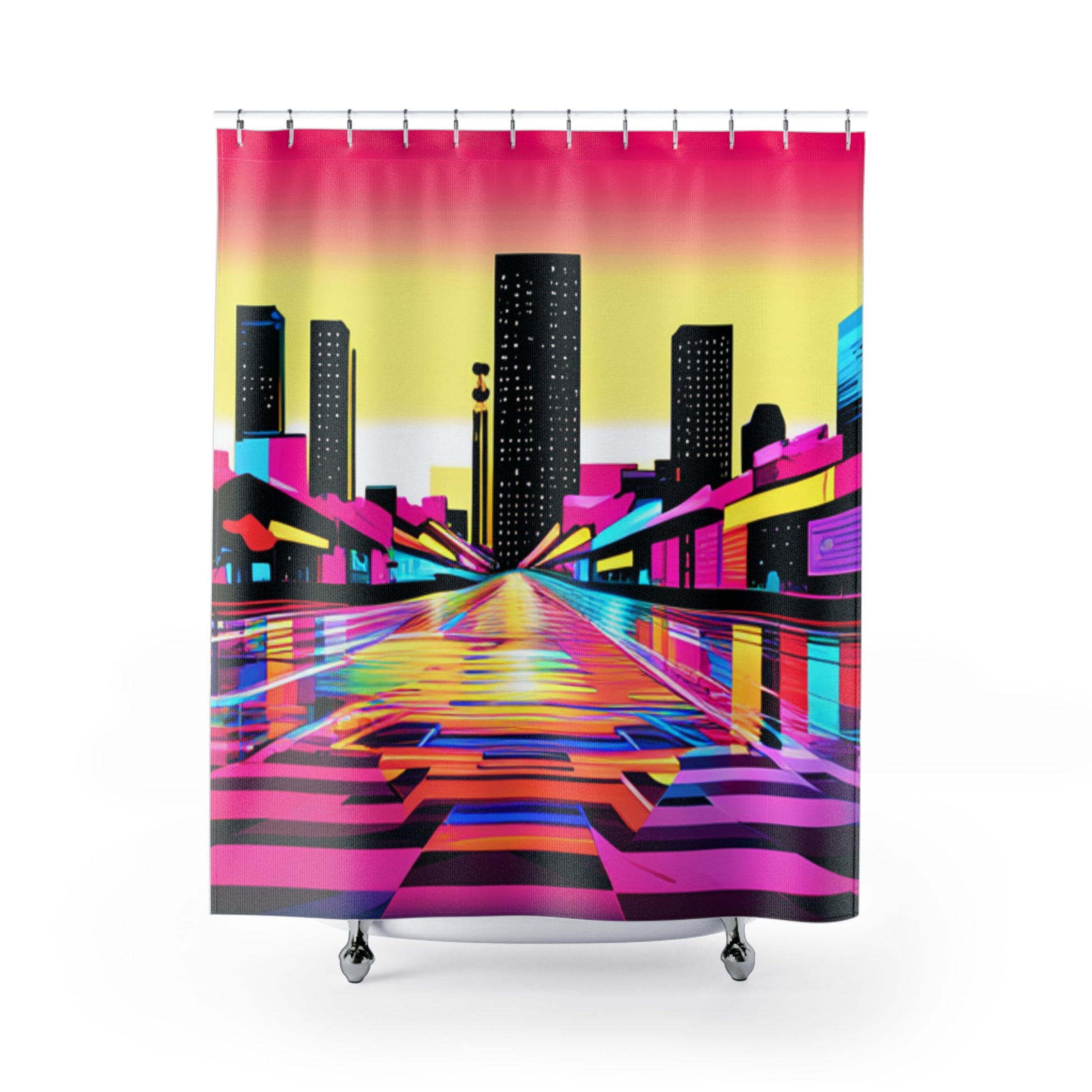 Transform your bathroom into a funky 80's cityscape with our shower curtain! Featuring vibrant colors, this curtain will add a pop of nostalgia to your daily routine.